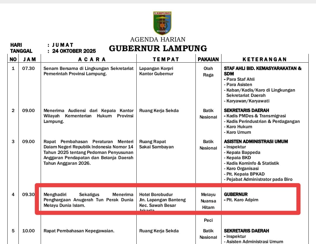 Spektroom - Gubernur Lampung Rahmat Mirzani Djauzal, hari ini, Jum'at 24 Oktober 2025 diagendakan menghadiri sekaligus menerima penghargaan Anugerah Tun Perak Dunia Melayu Dunia Islam (DMDI), di Jakarta.