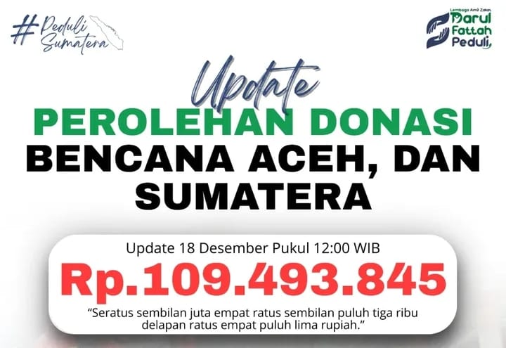 Dari penelusuran Spektroom diketahui Per tanggal 18 Desember 2025 pukul 12.00 WIB, amanah kebaikan yang telah terhimpun untuk bantuan terdampak bencana di Aceh dan wilayah Sumatera mencapai Rp 109.493.845 serta sejumlah barang barang dan logistik lainnya.