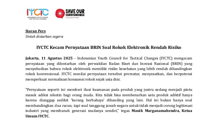 Spektroom - Indonesian Youth Council for Tactical Changes (IYCTC) mengecam pernyataan yang dilontarkan oleh peneliti Badan Riset dan Inovasi Nasional (BRIN) yang menyebutkan bahwa rokok elektronik memiliki risiko kesehatan yang lebih rendah dibandingkan rokok konvensional.