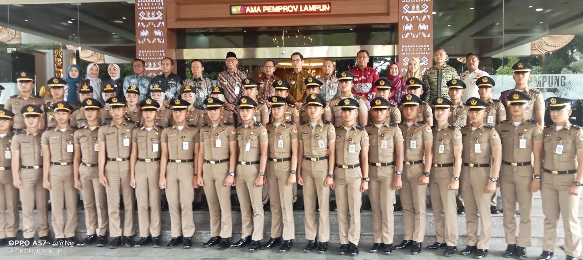 Spektroom - Gubernur Lampung Rahmat Mirzani Djauzal Jum'at (2/01/2026), menerima Praja Institut Pemerintahan Dalam Negri (IPDN), Taruna Akademi Tentara Nasional Indonesia (ATNI) dan Taruna Akademi Kepolisian (AKPOL). Kegiatan tersebut berlangsung di Ruang Rapat Utama Kantor Gubernur Lampung.