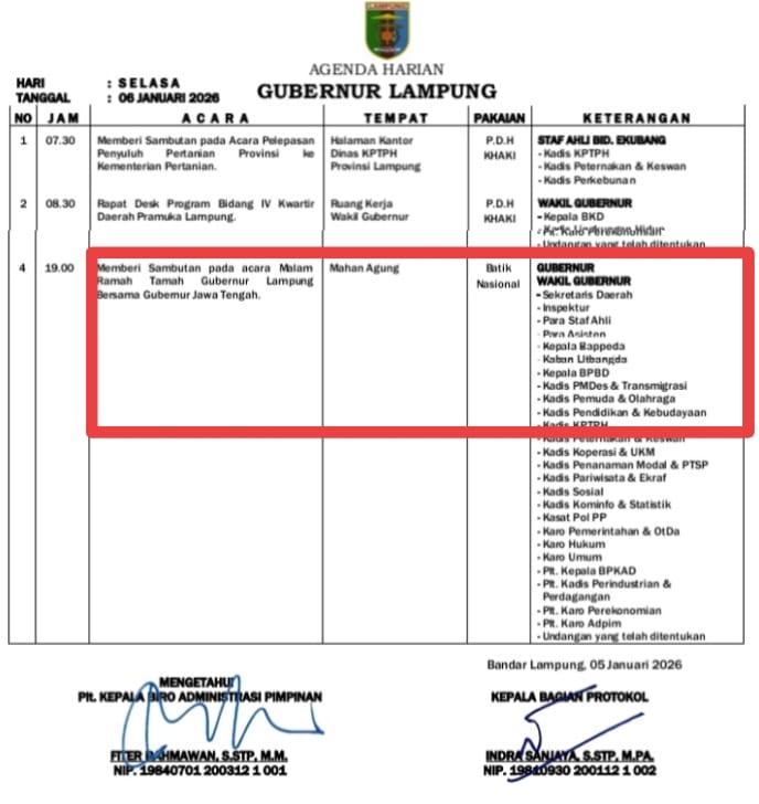 Merujuk pada Agenda Gubernur Lampung, malam ramah tamah tersebut juga akan dihadiri oleh Wakil Gubernur Jihan Nurlela, Sekdaprov Lampung Marindo Kurniawan, Para Asisten Sekda dan Staff Ahli Gubernur serta seluruh Kepala OPD dilingkungan Pemprov Lampung (@Ng)