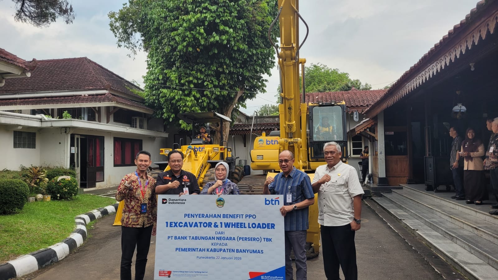Bantuan tersebut diserahkan Regional Digital Retail BTN Kantor Wilayah Jawa Tengah–DIY, Diah Mariani, kepada Bupati Banyumas Sadewo Tri Lastiono, Kamis (22/1/2026). Dua alat berat yang diterima meliputi satu unit excavator long arm dan satu unit wheel loader.