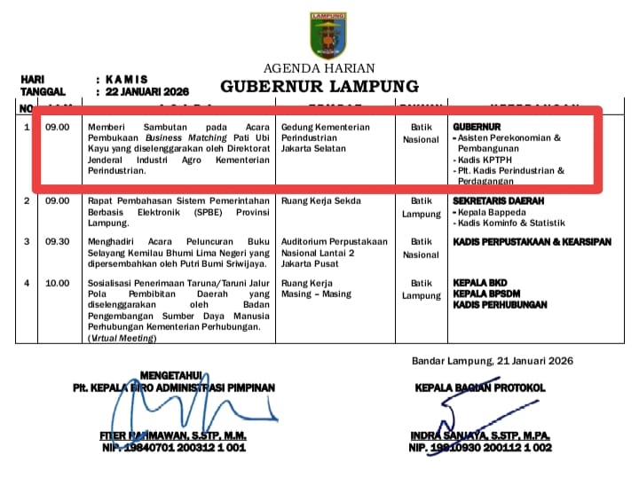 Merujuk Agenda Gubernur Lampung Hari Kamis, 22 Januari 2026, Gubernur Mirza akan didampingi Asisten Bidang Ekubang, Kepala Dinas Ketahanan Pangan dan Tanaman Pangan dan Hortikultura (KPTPH) dan Plt. Kepala Dinas Perindustrian dan Perdagangan Provinsi Lampung.(@Ng).