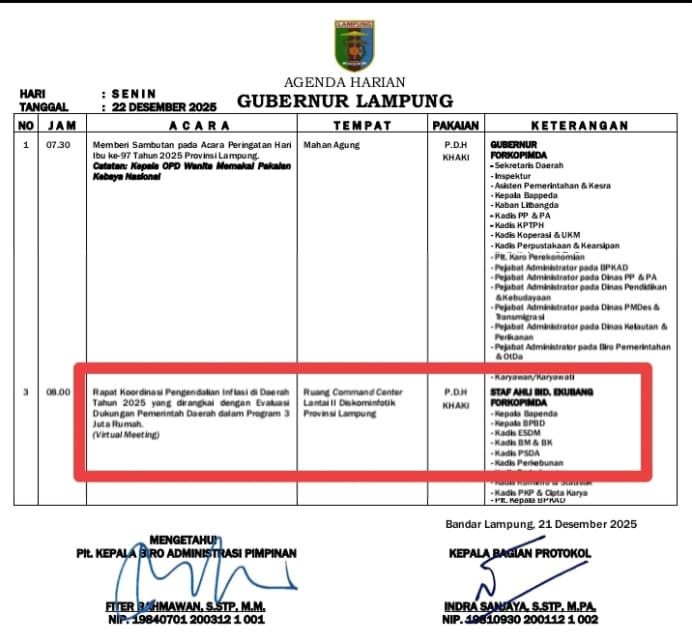 Sementara Rapat Koordinasi Pengendalian Inflasi di Daerah Tahun 2025 yang dirangkai dengan Evaluasi Dukungan Pemerintah Daerah dalam Program 3 Juta Rumah, berlangsung secara luring di Sasana Bhakti Praja Kemendagri, Jakarta Pusat, Senin (22/12/2025).