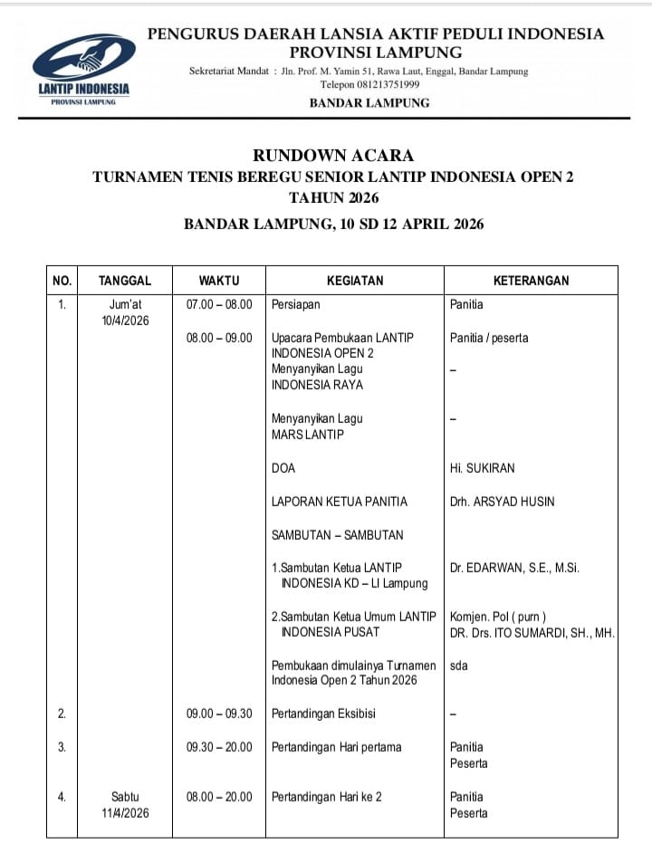 Bandarlampung - Spektroom: Dalam rangka memeriahkan HUT Provinsi Lampung Ke 62 Tahun 2026 Lansia Aktif Peduli Indonesia ( LANTIP ) Komisariat Daerah KD - LI Lampung akan menggelar Turnamen Tenis Beregu Senior Lantip Indonesia Open Ke 2 Tahun 2026 pada 10 s/d 12 April 2026 di bandar lampung memperebutkan Piala Ketua Umum Lantip.