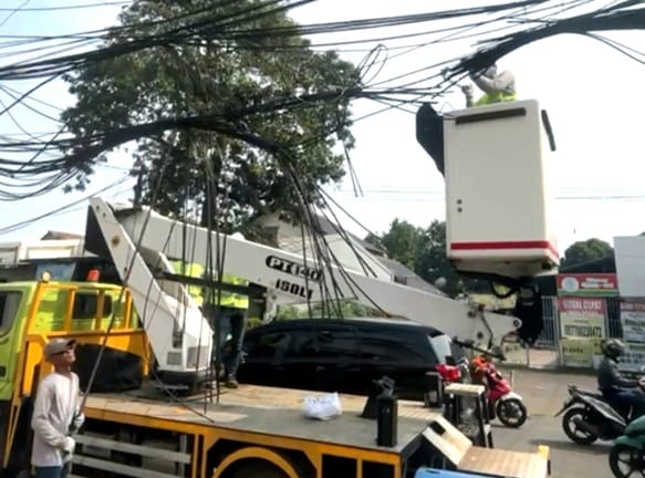 Depok - Spektroom: Dinas pekerjaan umum dan penata ruang ( PUPR ) Depok menurunkan kabel udara yang berada di kawasan jalan Radar Auri Cimanggis.