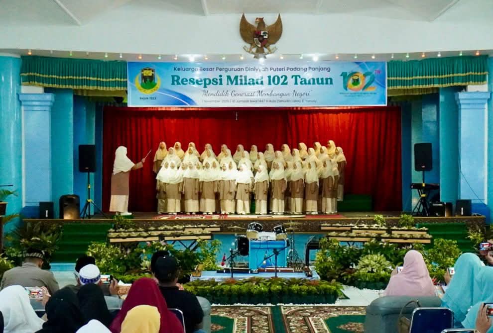 Spektroom - Perguruan Diniyyah Puteri Padang Panjang menggelar resepsi Milad ke-102 dengan mengusung tema “Mendidik Generasi, Membangun Negeri”, Sabtu (1/11/2025), di Aula Zainudin Labay.