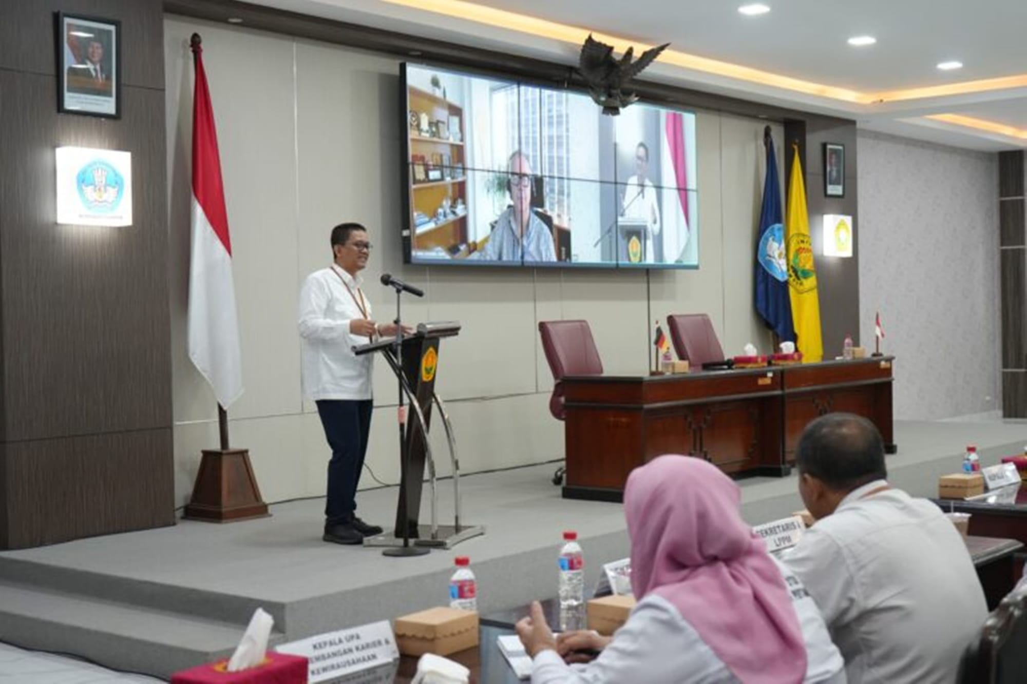 Guido Schnieders hadir secara daring dalam kegiatan sosialisasi program DAAD bertajuk “Your Gateway to Academic and Career Opportunities in Germany” yang digelar khusus untuk mahasiswa dan dosen UNEJ di aula lantai 3 gedung rektorat (22/9/2025).