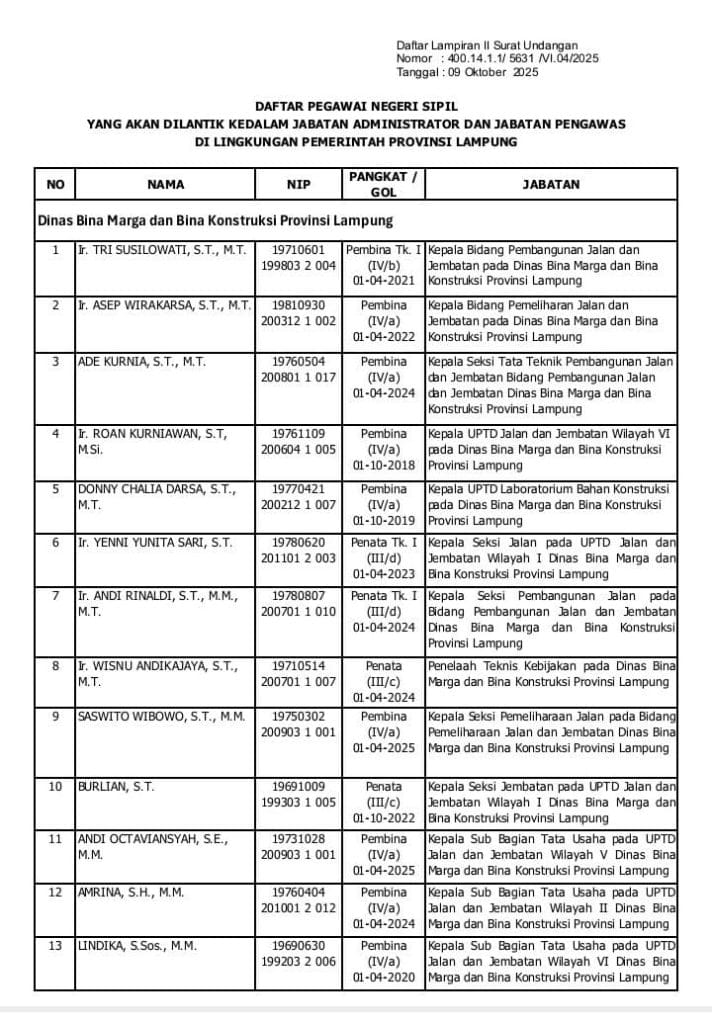 Selanjutnya, Surat Keputusan Gubernur Lampung Nomor: 800.1.3.3/5622/VI.04/2025 tentang Pengangkatan melalui Perpindahan dari Jabatan Lain ke dalam Jabatan Fungsional di Lingkungan Pemerintah Provinsi Lampung;