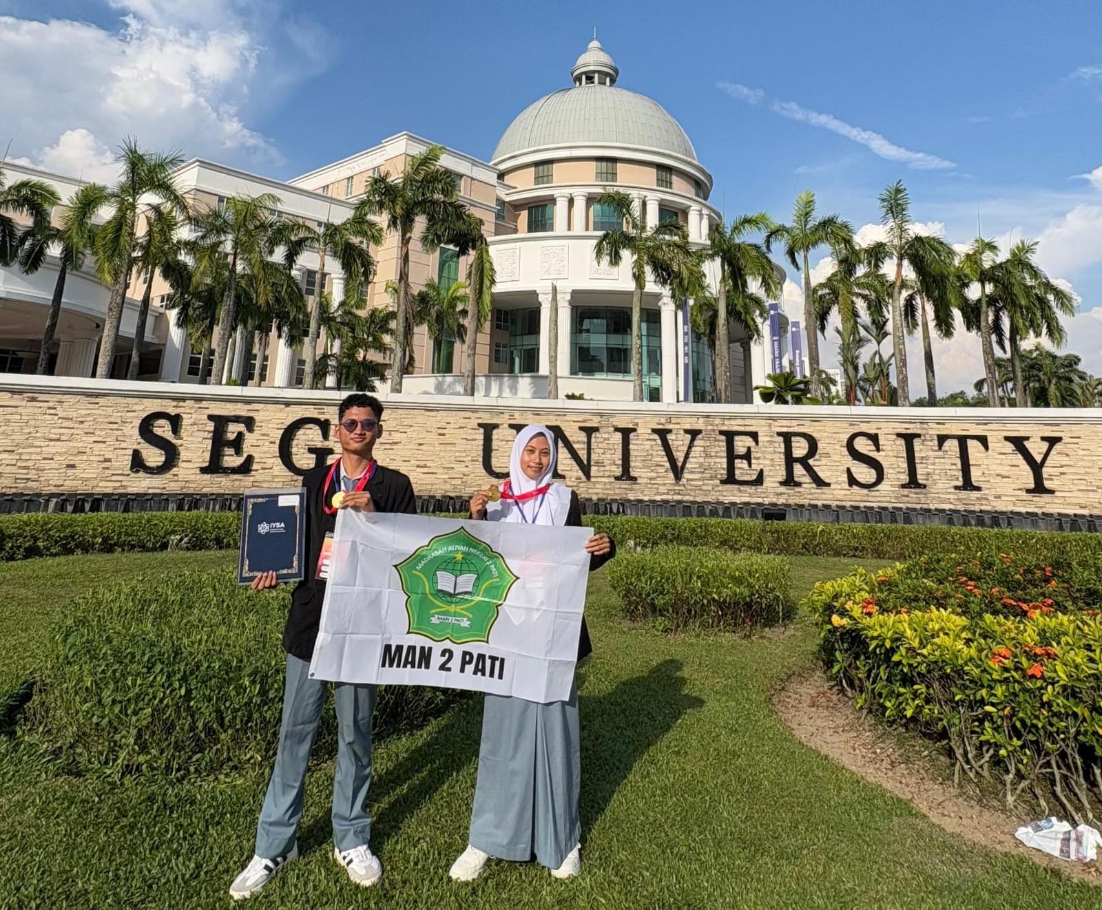 Spektroom – Senyum lega terpancar dari wajah Elysa Fitriandari (XII-1) dan Muhammad Atmimlana Nurona (XI-11). Dua siswa MAN 2 Pati ini sukses mengharumkan nama sekolah dengan meraih medali emas pada ajang World Invention Competition and Exhibition (WICE) 2025, yang berlangsung di SEGi University, Malaysia, 21–25 September 2025.