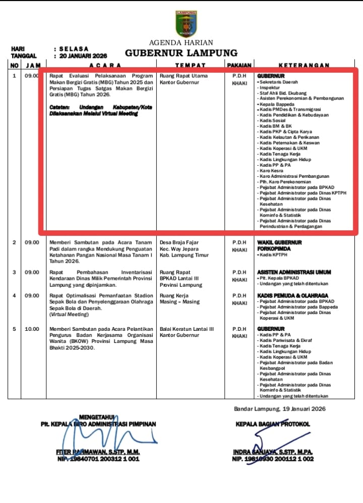Spektroom - Gubernur Lampung Rahmat Mirzani Djauzal memimpin rapat evaluasi program Makan Bergizi Gratis (MBG) tahun 2025 dan persiapan tugas satgas MBG tahun 2026 di Ruang Rapat Utama kantor Gubernur Lampung di Bandarlampung, Selasa (20/1/2026).