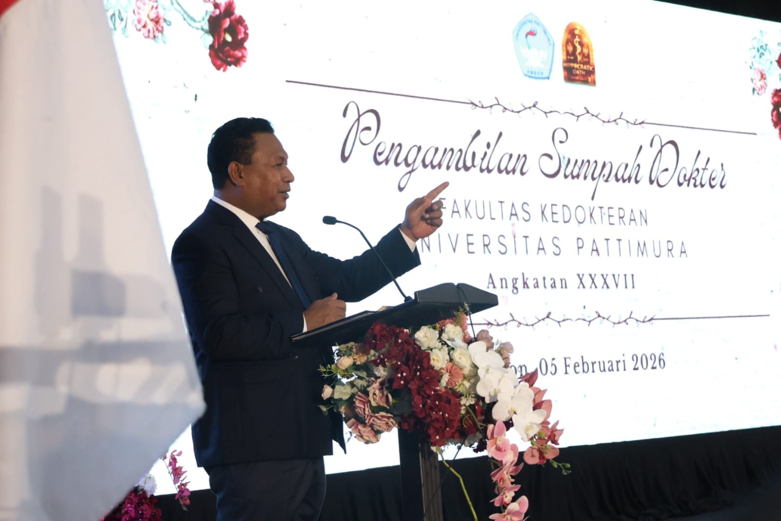 Spektroom ,– Wakil Gubernur Maluku, H. Abdullah Vanath, menghadiri acara Pengambilan Sumpah Dokter Fakultas Kedokteran Universitas Pattimura (Unpatti) Angkatan ke-37, yang diikuti oleh 71 dokter baru, dalam rangkaian yudisium yang berlangsung di Gedung Islamic Center Kota Ambon, Kamis (5/2/2026).
