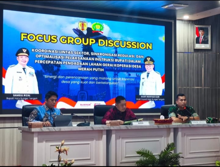 Barabai–Spektroom : Kodim 1002/Hulu Sungai Tengah bersama Pemerintah Kabupaten Hulu Sungai Tengah (HST) menggelar Focus Group Discussion (FGD) percepatan pengadaan lahan gerai Koperasi Desa Merah Putih, Kamis (16/4/2026), di Auditorium Setda HST.