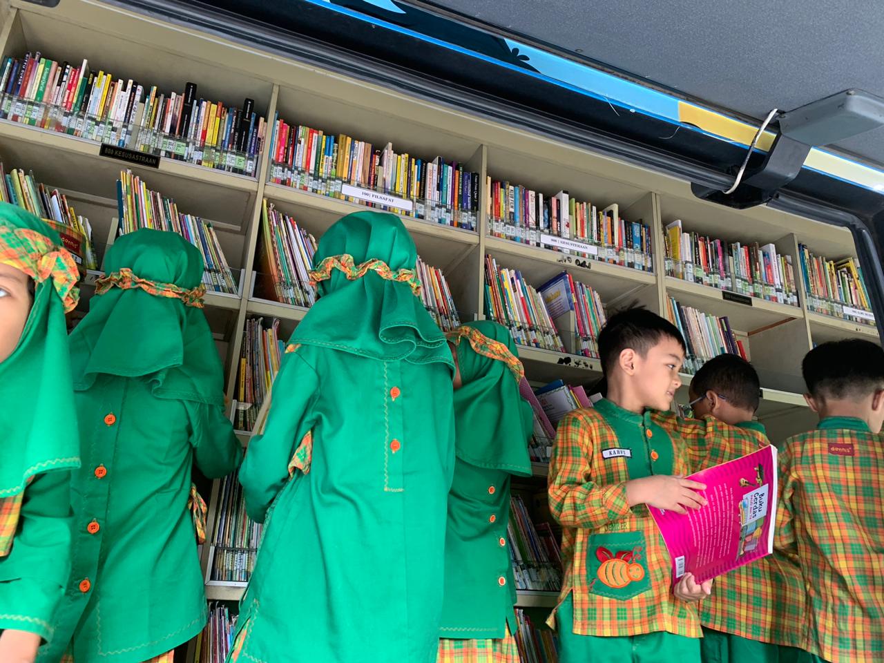Kedatangan bus perpustakaan disambut antusias oleh para guru dan peserta didik TK Al Furqon Jember, Jawa Timur. Sejak pagi, halaman sekolah tampak ramai dengan deretan anak-anak yang bersemangat menunggu giliran memasuki bus pustaka. Petugas dari Dinas Perpustakaan dan Kearsipan Kabupaten Jember bersama beberapa mahasiswa magang membantu anak-anak memilih buku sesuai minat mereka.