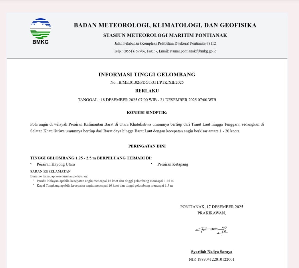 Di tengah kewaspadaan terhadap aktivitas seismik, BMKG melalui Stasiun Meteorologi Maritim Pontianak juga mengeluarkan peringatan dini terkait kondisi cuaca maritim di wilayah perairan Kalimantan Barat.