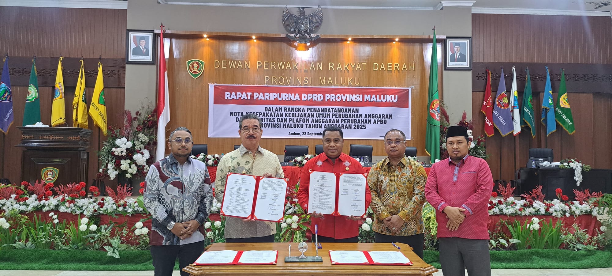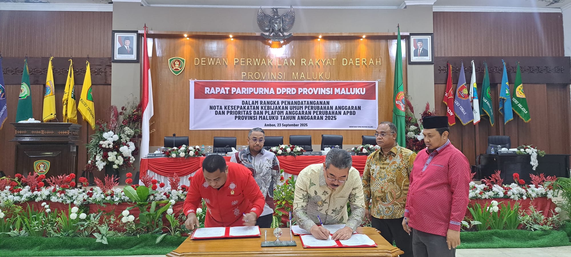 Spektroom , - Paripurna DPRD Maluku kembali mencatat sejarah penting dalam perjalanan tata kelola keuangan daerah. Selasa malam (23/9/2025), Gubernur Hendrik Lewerissa bersama Ketua DPRD Benhur Watubun resmi menandatangani nota kesepakatan Kebijakan Umum Perubahan Anggaran (KUPA) dan Prioritas Platform Anggaran Perubahan (PPAP) APBD Provinsi Maluku Tahun Anggaran 2025.