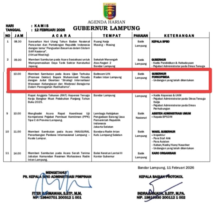 Spektroom - Gubernur Lampung Rahmat Mirzani Djauzal hari ini Kamis (12/2/2026) pukul 10.00 WIB, dijadwalkan akan menghadiri dan menyampaikan sambutan pada Acara, Ujian Terbuka (Promosi Doktor) Promovendus Muhammad Firsada (Asisten Bidang Pemerintahan dan Kesra), dengan Judul Disertasi “Strategi Internalisasi Wawasan Kebangsaan dan Moderasi Beragama Dalam Pencegahan Radikalisme”, berlangsung di Ballroom UIN Raden Intan Lampung.