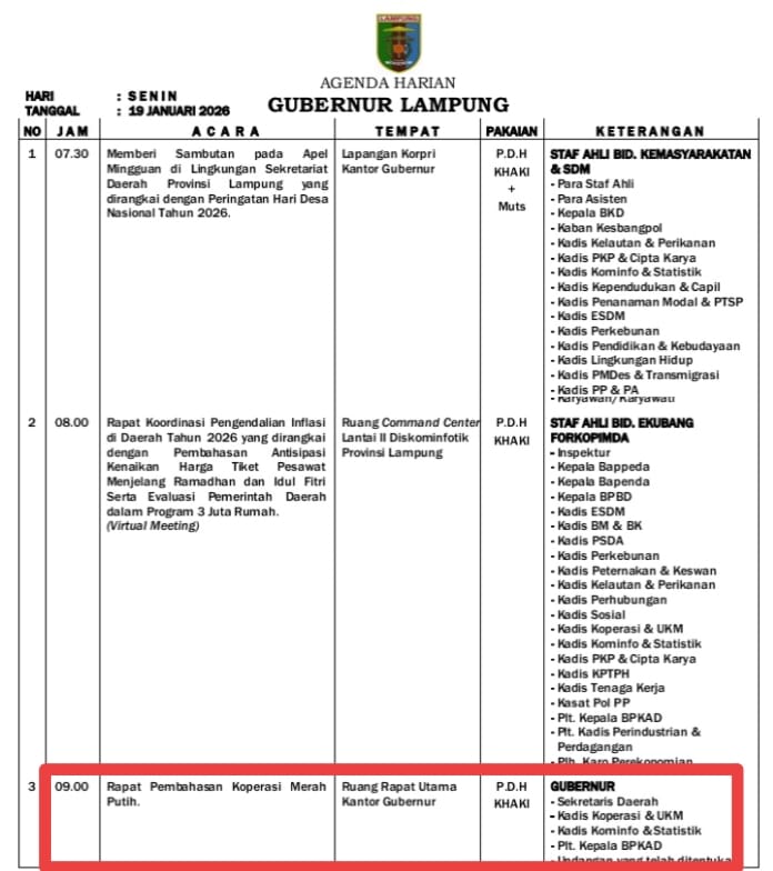 Spektroom - Pemerintah Provinsi Lampung berencana menggelar kegiatan Rapat Koordinasi Rencana Kerja Koperasi Merah Putih. Rapat yang akan berlangsung, Senin, 19 Januari 2026, Pukul 09.00 Wib berlangsung di Ruang Rapat Utama Kantor Gubernur Lampung dipimpin oleh Gubernur Lampung Rahmat Mirzani Djauzal.