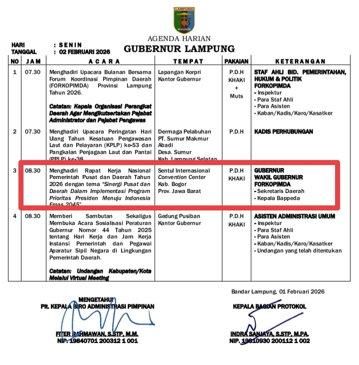 Merujuk pada Agenda Gubernur Lampung, Senin, 2 Februari 2026, Wakil Gubernur Lampung Jihan Nurlela Chalim , Anggota Forum Komunikasi Pimpinan Daerah (Forkopimda), Sekretaris Daerah Propinsi (Sekdaprov) Lampung Marindo Kurniawan serta Kepala Bappeda Anang Risgiyanto, juga mengikuti Rapat Kerja Nasional Pemerintah Pusat dan Daerah Tahun 206 tersebut (@Ng).