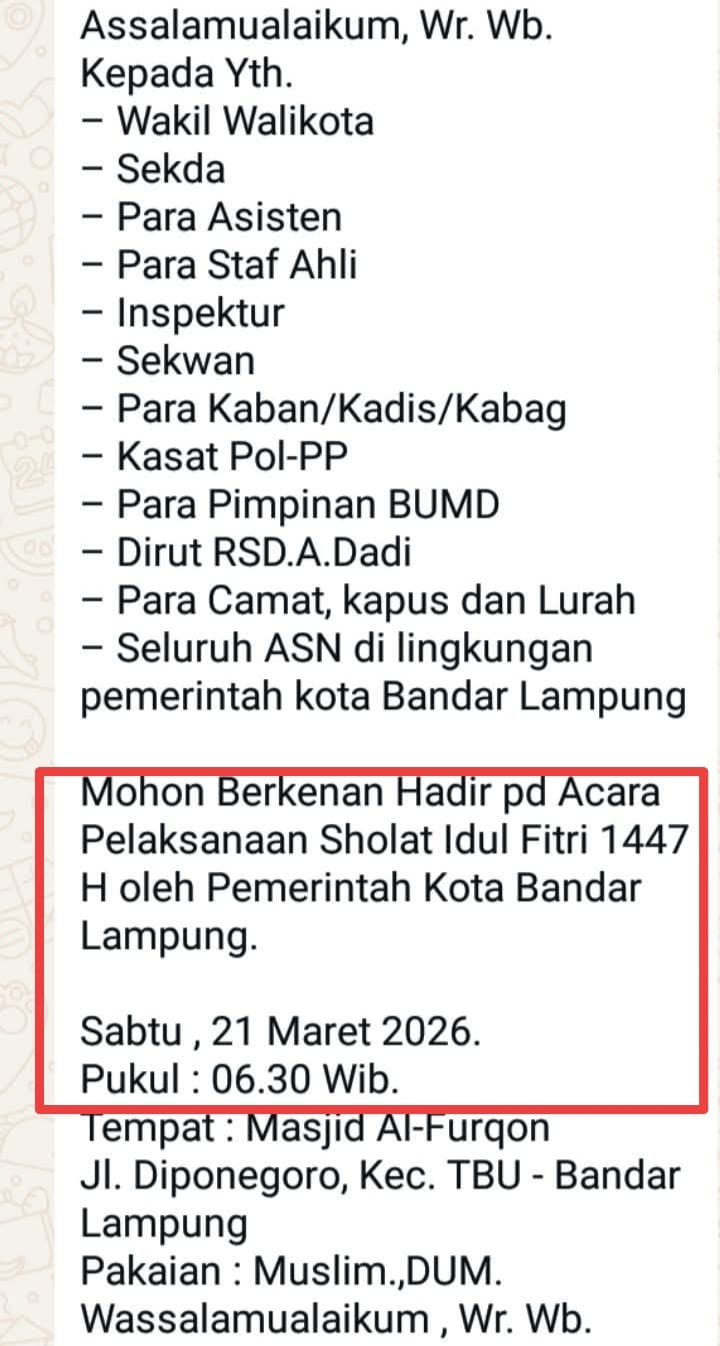 Sementara Walikota Bandarlampung Eva Dwiana bersama Wakil Walikota Deddy Amrullah besera para asisten, staf ahli walikota, kepala OPD serta Camat dan lurah, dijadwalkan akan menjalankan Shalat Ied di Masjid Al Furqon, Bandarlampung (@Ng).