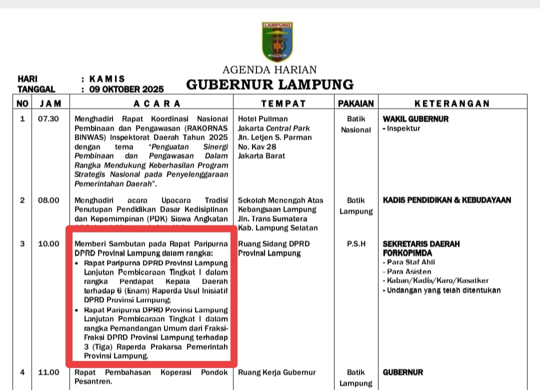 Dari Agenda Gubernur Lampung yang di tandatangani Kepala Bagian Protokol Indra Sanjaya diketahui, Marindo Kurniawan juga akan menyampaikan Pendapat Kepala Daerah terhadap 6 (Enam) Raperda Usul Inisiatif DPRD Provinsi Lampung, Kamis (9/10/2025) Pukul 10.00 WIB.