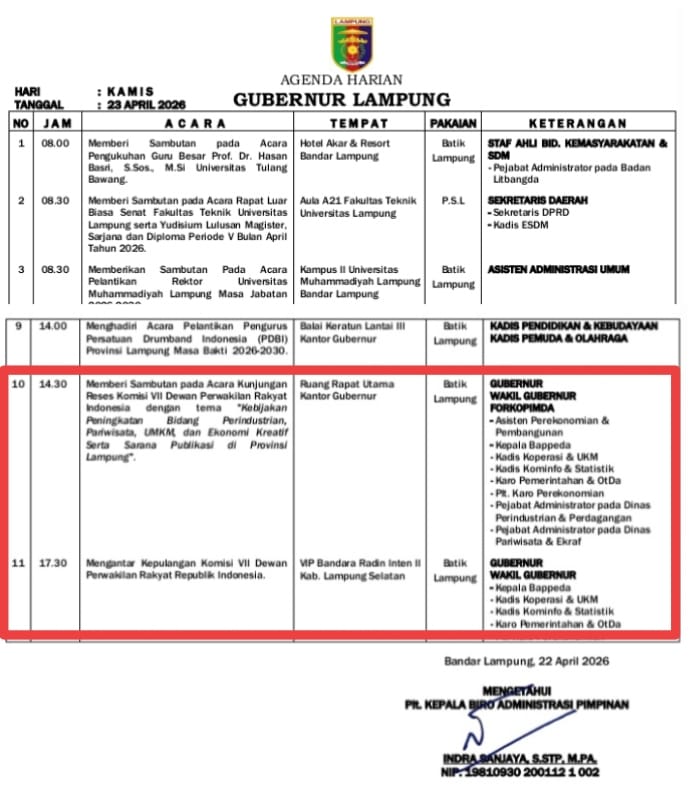 Merujuk pada Agenda Gubernur, Kamis Tanggal 23 April 2026, Pukul 14.30 Gubernur Mirza akan menyampaikan sambutan pada Kunjungan Reses Komisi VII Dewan Perwakilan Rakyat Indonesia dengan tema "Kebijakan Peningkatan Bidang Perindustrian, Pariwisata, UMKM, dan Ekonomi Kreatif Serta Sarana Publikasi di Provinsi Lampung", bertempat di Ruang Rapat Utama Kantor Gubernur, di Bandarlampung.