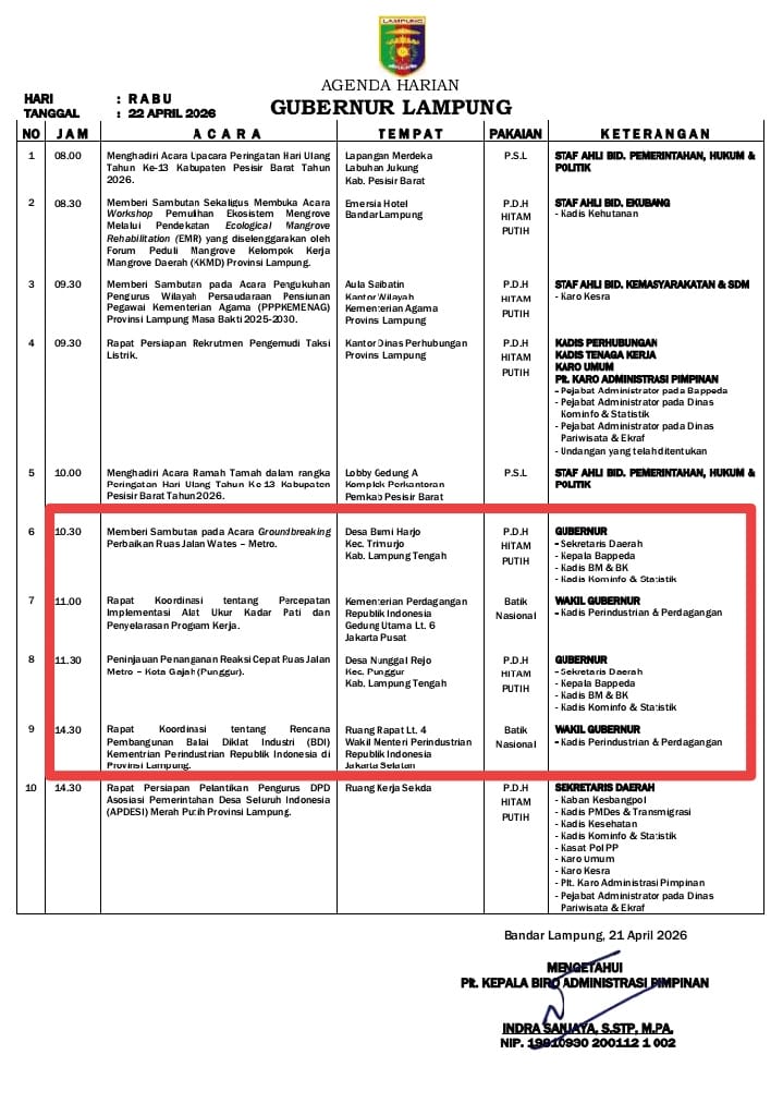 Merujuk pada Agenda Gubernur, Rabu Tanggal 22 April 2026, Pukul 11.30 dari Wates Gubernur Mirza melanjutkan kunjungan kerjanya ke Kota Metro untuk meninjau Penanganan Reaksi Cepat Ruas Jalan Metro – Kota Gajah Desa Nunggal Rejo Kecanatan Punggur Lampung Tengah.