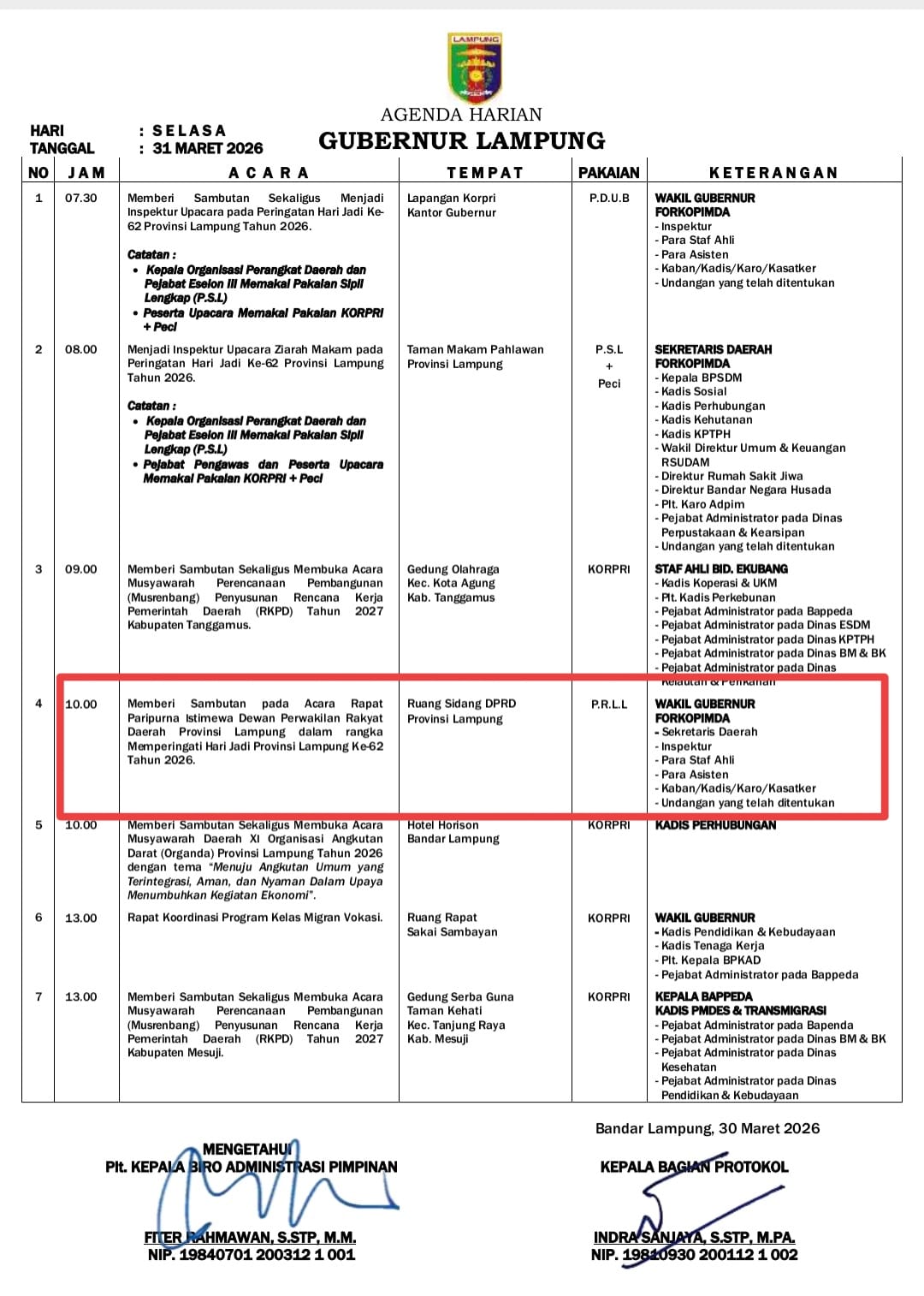 Selanjutnya pukul 10.00 WIB Wakil Gubernur Jihan Menghadiri Rapat paripurna Istimewa DPRD Lampung dalam rangka memperingati Hari Jadi Ke 62 Pemerintah Provinsi Lampung Tahun 2026.