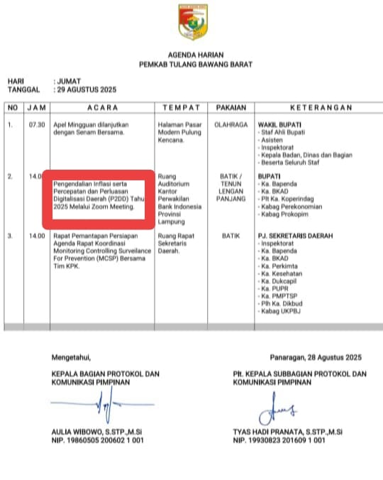 Sedianya Bupati Tulang Bawang Barat Ir. Novriwan Jaya, S.P., diagendakan menghadiri Rapat Koordinasi Nasional Pengendalian Inflasi dan Perluasan Digitalisasi Daerah 2025, secara virtual dari Auditorium Bank Indonesia Perwakilan Lampung, Jum'at (29/8/2025).