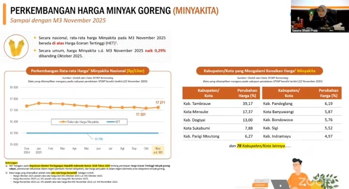 Adininggar juga menjelaskan, untuk harga minyak goreng Minyak Kita, masih di atas Harga Eceran Tertinggi (HET), Rp.17.271. Terutama ada di kota Sukabumi, Tambrau, Merauke, dan 78 kabupaten-kota lainnya.