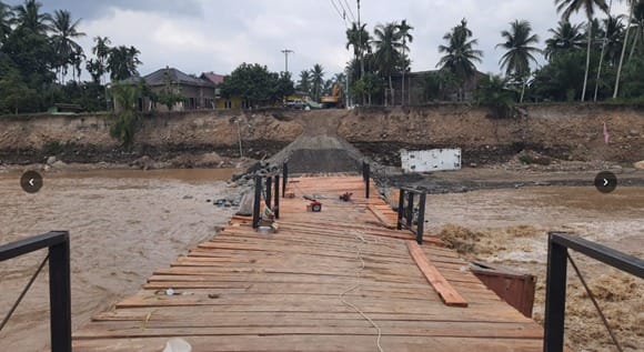 Namun, intensitas hujan ekstrem pada 17 Februari 2026 kembali menyebabkan debit Sungai Peusangan meningkat signifikan sehingga menggerus dua pondasi pilar jembatan darurat tersebut.