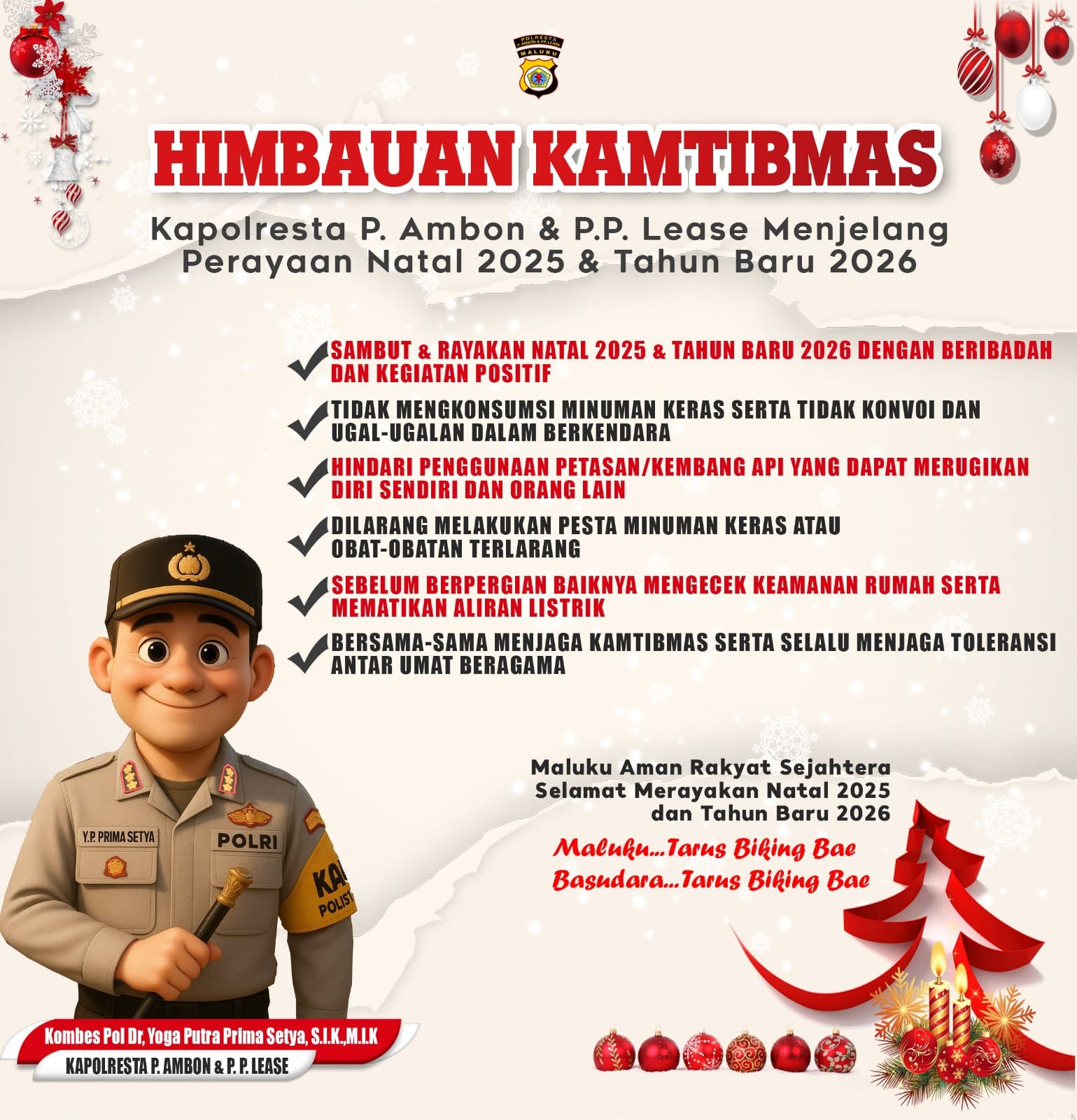 Spektroom – Kapolresta Pulau Ambon dan Pulau-Pulau Lease, Kombes Pol. Yoga Putra Prima Setya, menegaskan komitmen kepolisian menjaga keamanan dan ketertiban masyarakat (kamtibmas) menjelang Natal 2025 dan Tahun Baru 2026. Segala bentuk pelanggaran hukum, mulai dari miras, konvoi kendaraan hingga balap liar, dipastikan akan ditindak tegas tanpa kompromi.