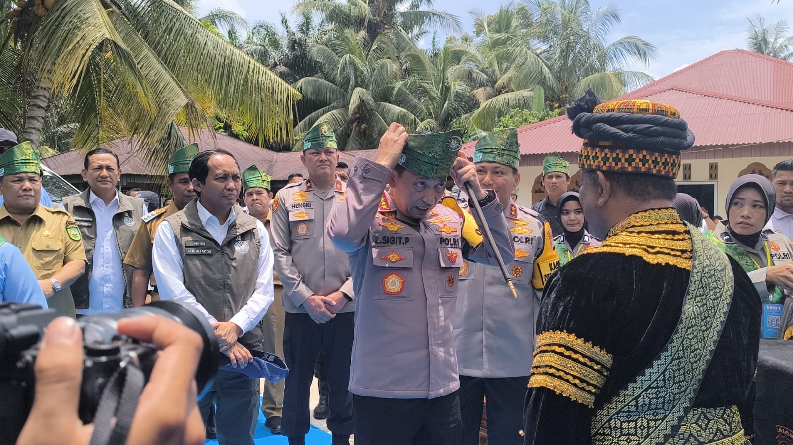 Jenderal Sigit bersama Titiek Soeharto, Menhut Raja Juli Antoni dan rombongan tiba di lokasi acara yang dipusatkan di Desa Gobah, Kecamatan Tambang, Kabupaten Kampar, Riau, Selasa (17/3/2026) siang. Kedatangan mereka disambut dengan prosesi pengalungan kain songket dan tanjak oleh Lembaga Adat Kampar.
