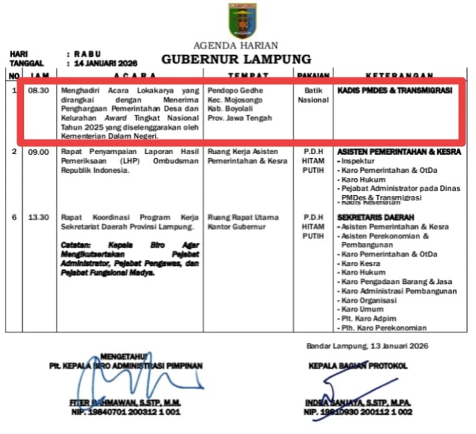 Spektroom - (07 : 29) Mewakili Gubernur Lampung Rahmat Mirzani Djauzal Kepala Dinas Pemberdayaan Masyarakat, Desa & Transmigrasi (PMDT) Provinsi Lampung Saipul, Rabu 14 Januari 2026, Pukul 08.30 WIB dijadwalkan akan menghadiri Lokakarya yang dirangkai dengan Penyerahan Penghargaan Pemerintahan Desa dan Kelurahan Award Tingkat Nasional Tahun 2025 yang diselenggarakan oleh Kementerian Dalam Negeri, berlangsung di Pendopo Gedhe Kec. Mojosongo Kab. Boyolali Prov. Jawa Tengah.