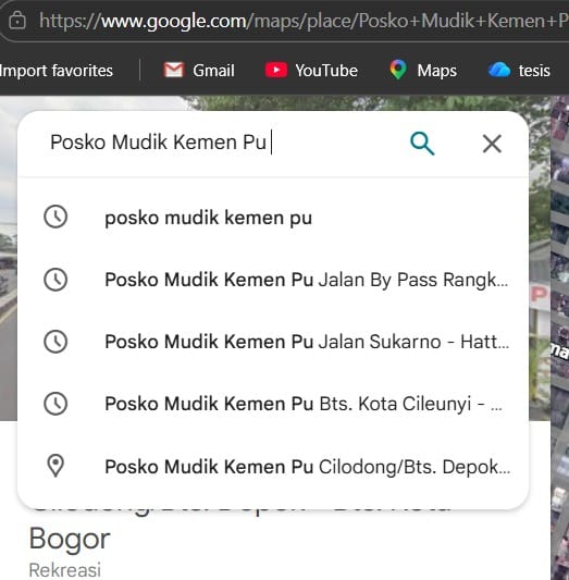 Melalui integrasi dengan Google Maps, pemudik cukup mengetikkan kata kunci “Posko Mudik Kemen PU” pada kolom pencarian Google atau Google Maps untuk menemukan lokasi posko terdekat yang dapat dimanfaatkan sebagai tempat beristirahat selama perjalanan.
