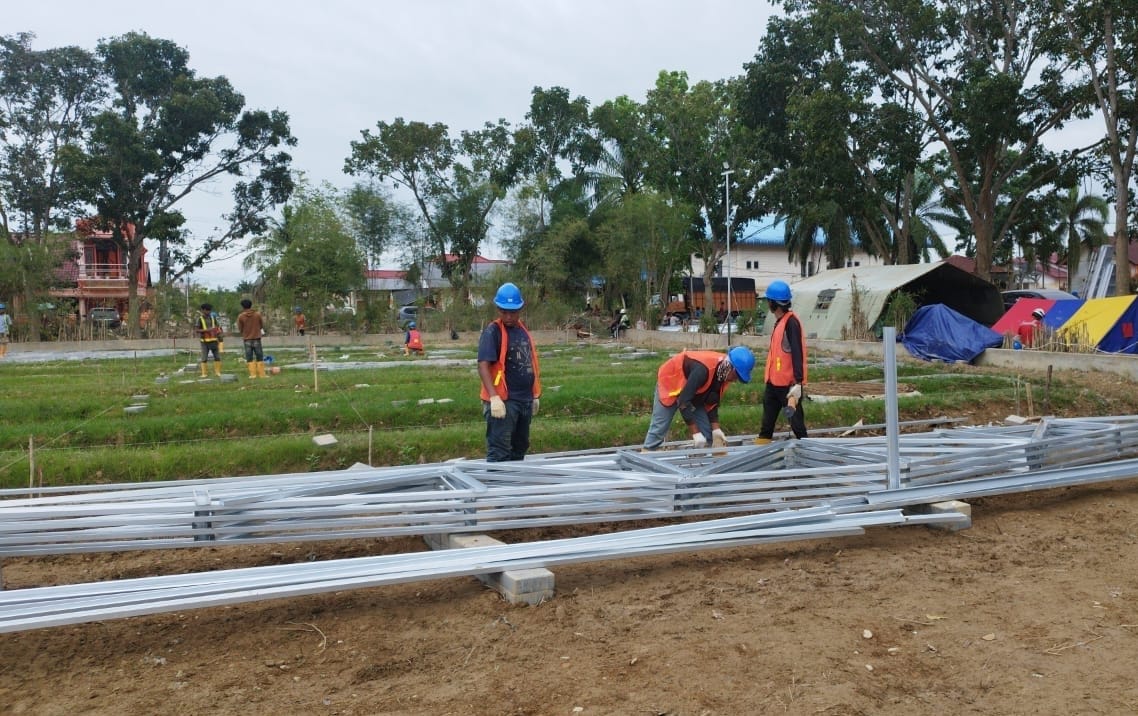 Dari sisi konstruksi, pembangunan huntara menerapkan sistem modular yang memungkinkan proses pembangunan dilakukan secara cepat, aman, dan kokoh, sehingga dapat segera dimanfaatkan oleh masyarakat. Huntara dirancang menggunakan rangka baja ringan yang kuat dan tahan lama, dengan material pendukung berupa papan semen, multipleks lantai, serta atap zincalume, guna memastikan aspek keselamatan, kenyamanan, dan kelayakan huni.