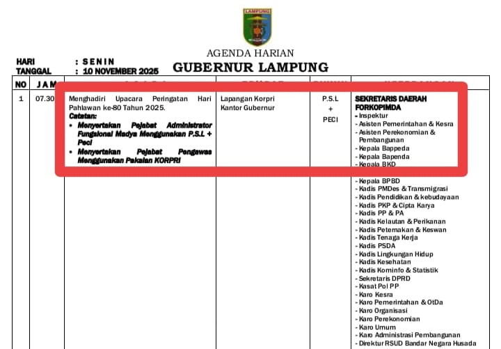 Sementara di Lampung, Sekretaris Daerah Provinsi Sekdaprov Lampung Marindo Kurniawan mengikuti Upacara Peringatan Hari Pahlawan bertempat di Lapangan Korpri Kantor Gubernur, Senin (10/11/2025).