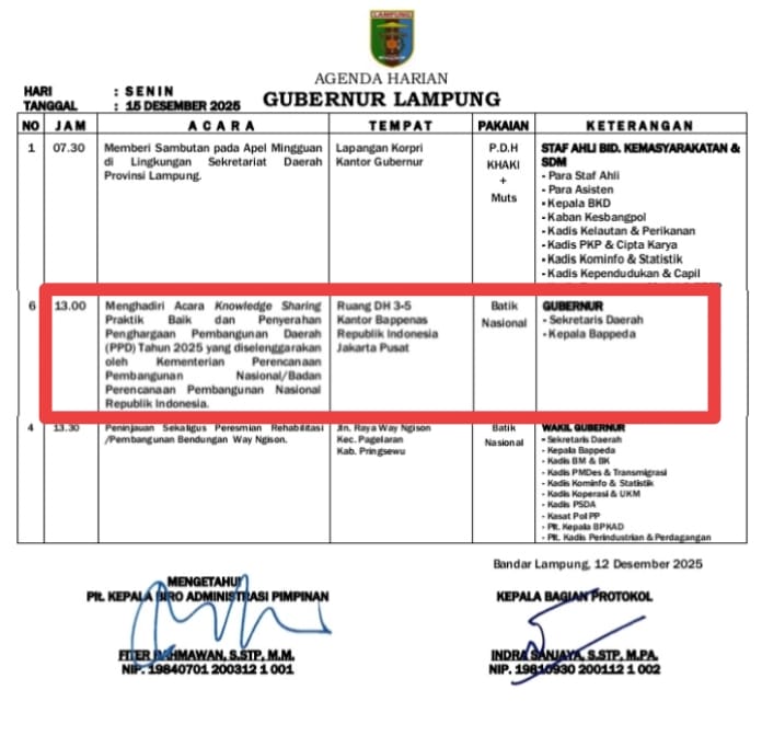 Spektroom - Gubernur Lampung Rahmat Mirzani Djauzal hari ini (15/12/2025)Pukul. 13.00 WIB diagendakan menghadiri acara Knowledge Sharing Praktik Baik dan Penyerahan Penghargaan Pembangunan Daerah (PPD) Tahun 2025.
