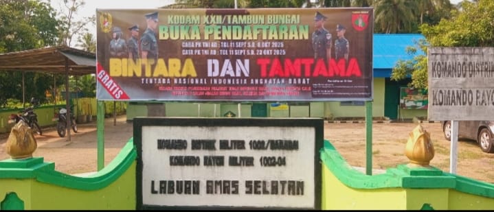 Spektroom – Kodim 1002/Hulu Sungai Tengah (HST), Kalsel, melalui jajaran Koramil melaksanakan pemasangan spanduk rekrutmen Prajurit TNI untuk Tamtama dan Bintara PK Tahun Anggaran 2025, Jum'at (26/9/2025).