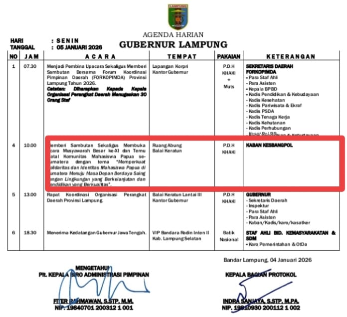 Spektroom - (06.30) Kepala Badan Kesatuan Bangsa dan Politik (Kaban Kesbangpol) Provinsi Lampung Dr. Senen Mustakim, S.Sos., M.Si. Dijadwalkan akan membuka acara Musyawarah Besar ke-XI dan Temu Natal Komunitas Mahasiswa Papua seSumatera (KOMPASS), pada Senin 5 Januari 2026 pukul 10.00 Wib.