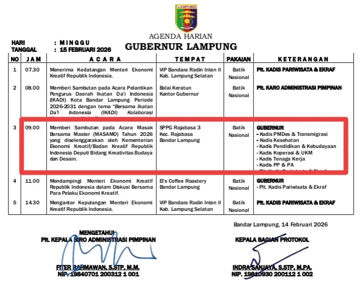 Spektroom - Gubernur Lampung Rahmat Mirzani, Djauzal, diagendakan besok, Minggu 15 Februari 2026 menghadiri acara masak bersama master (MASAMO) Tahun 2026 yang diselenggarakan oleh Kementerian Ekonomi Kreatif/Badan Kreatif Republik Indonesia Deputi Bidang Kreativitas Budaya dan Desain.