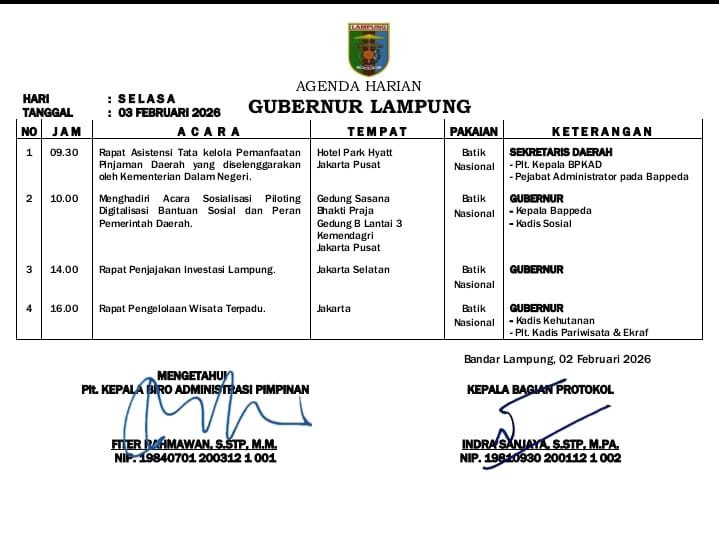 Spektroom - Gubernur Lampung Rahmat Mirzani Djauzal pagi ini, Selasa 3 Februari 2026 pukul 10.00 WIB, dijadwalkan menghadiri Acara Sosialisasi Piloting Digitalisasi Bantuan Sosial dan Peran Pemerintah Daerah.
