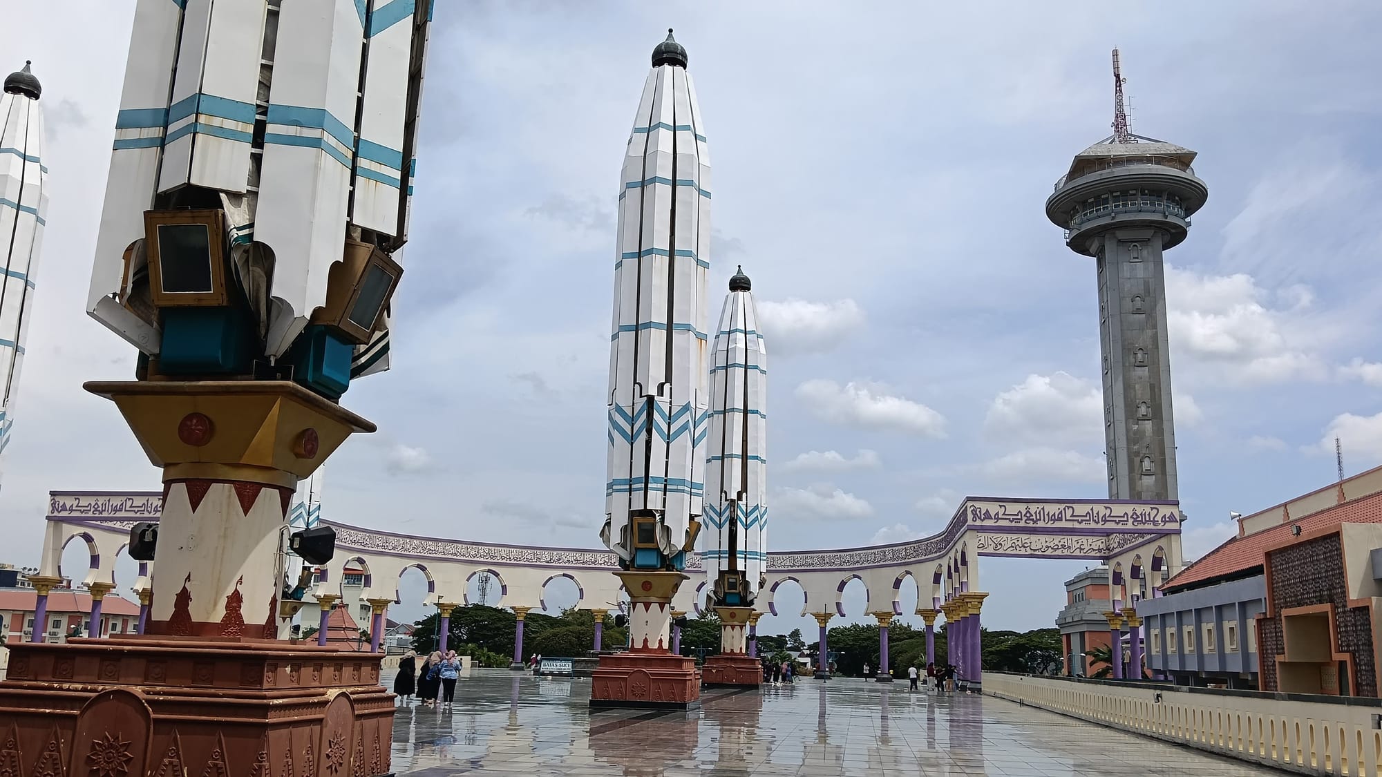 Diantaranya, foto didekat Alquran Raksasa yang ada di ruang utama masjid, selain di serambi dengan latar belakang Menara Al Husna dan payung raksasa yang mirip dengan payung raksasa di Masjid Nabawi Madinah Arab Saudi. Sayang sekali pada hari-hari biasa payung raksana itu tidak dibuka.
