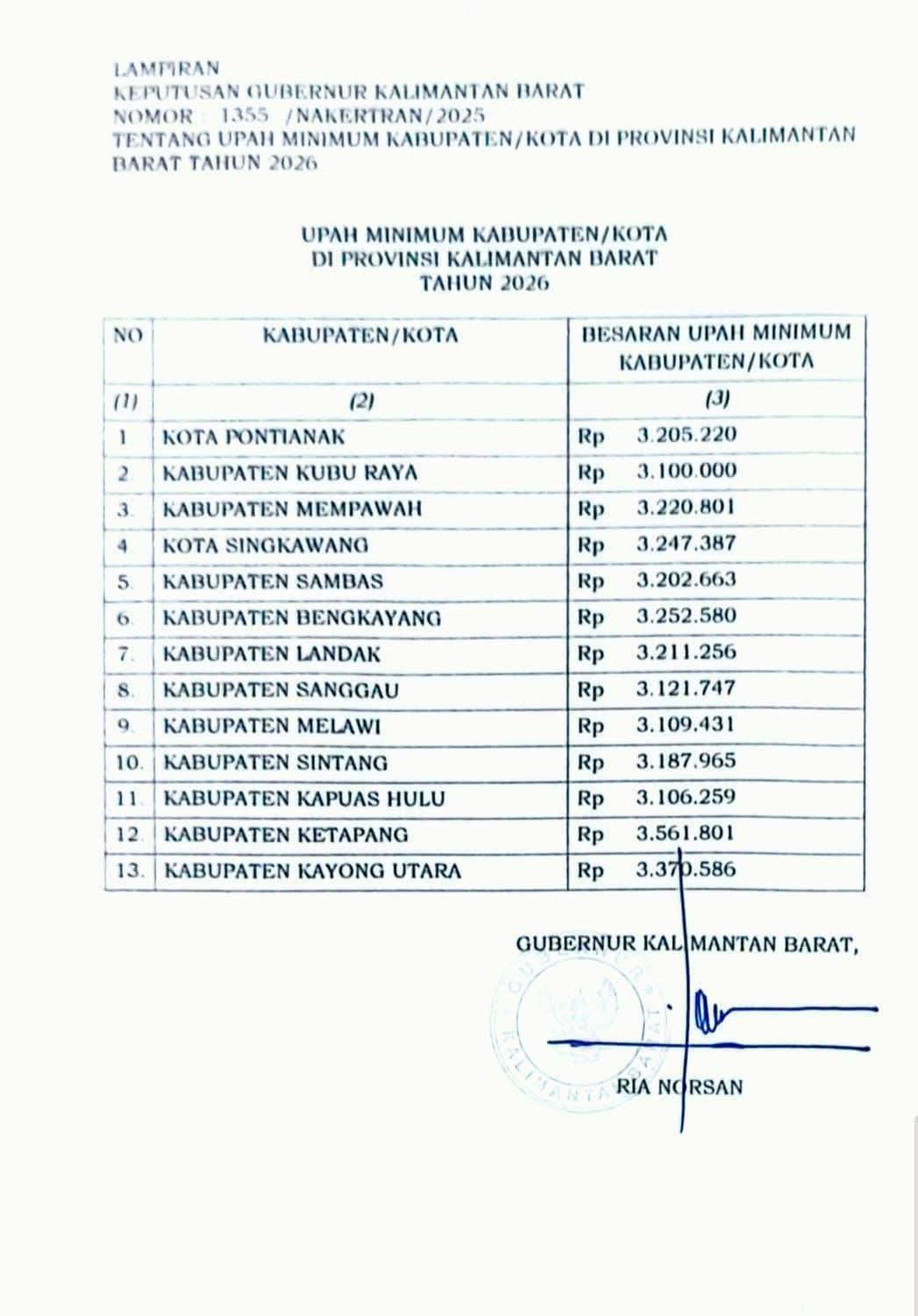 Oleh karenanya Awal tahun 2026 Gubernur Kalbar mengeluarkan dan mengumumkan Upah Minimum Provinsi dan Kabupaten Kalbar dengan Surat Keputusan nomor: 355/Nakertrans/ 2025.