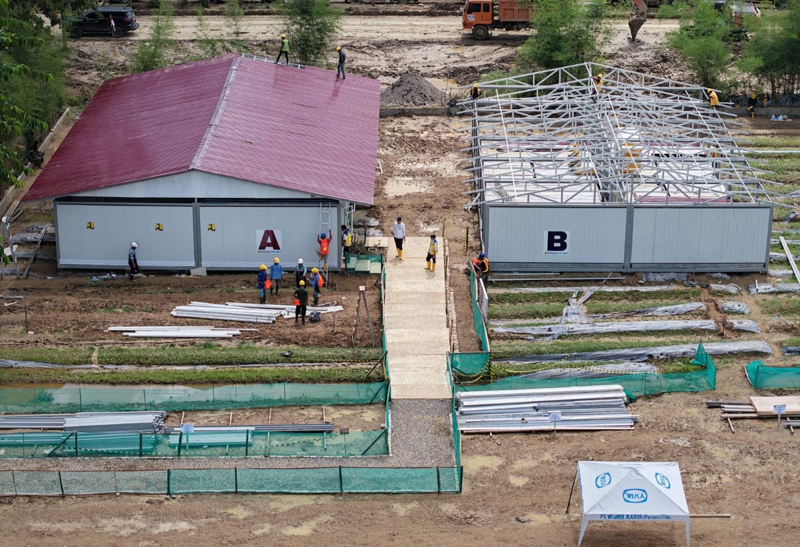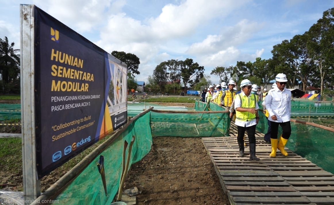 Pembangunan huntara di Aceh Tamiang dilaksanakan oleh Direktorat Jenderal Prasarana Strategis Kementerian PU bekerja sama dengan BUMN Karya PT Wijaya Karya (Persero) Tbk. Progres pembangunan berjalan cepat, dari tahap pekerjaan pondasi hingga atap modular.