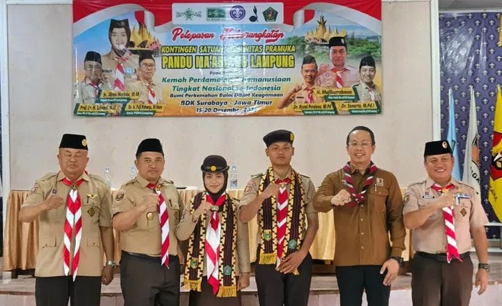 Spektroom - Ketua Harian Kwartir Daerah (Kwarda) Gerakan Pramuka Provinsi Lampung Kak Riski Sofyan, Minggu (14/12/2025) sore di Aula Pusdiklat melepas 58 Pramuka yang akan mengikuti Kemah Perdamaian Sako Ma’arif NU di Surabaya pada 15 hingga 20 Desember 2025 mendatang.