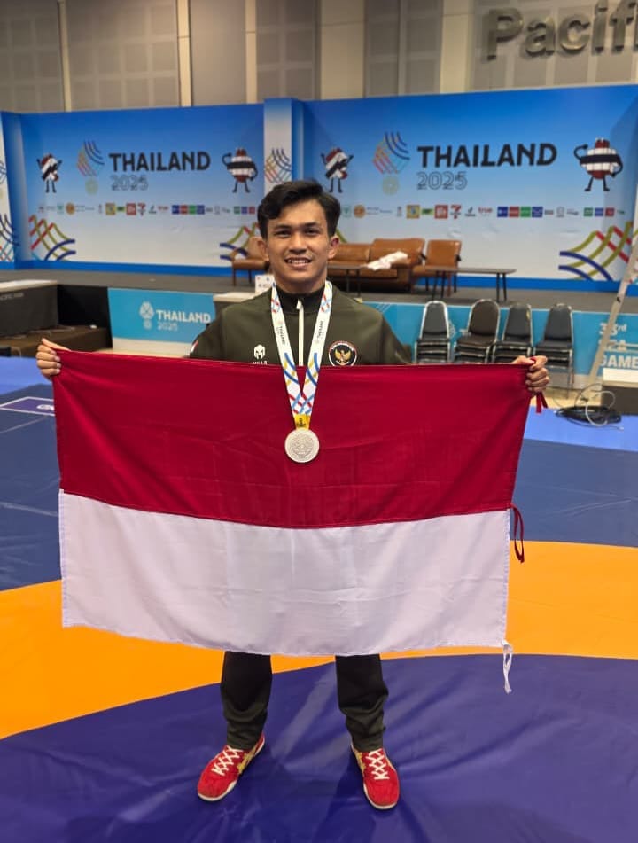 Spektroom - Pegulat Indonesia asal Sumatera Barat, Gilang Ilhaza, sukses mempersembahkan medali perak kelas 74 kilogram gaya bebas putra pada ajang SEA Games 2025 yang digelar di Thailand, Jumat (19/12/2025)