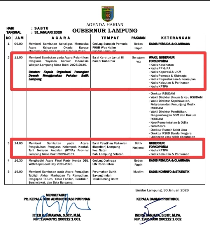 Sementara dihari yang sama Gubernur Lampung Rahmat Mirzani Djauzal pada pukul 14.00 WIB akan menghadiri dan menyampaikan sambutan pada Acara Pengukuhan Pengurus Kelompok Kontak Tani Nelayan Andalan (KTNA) Provinsi Lampung Masa Bakti 2026-2031.