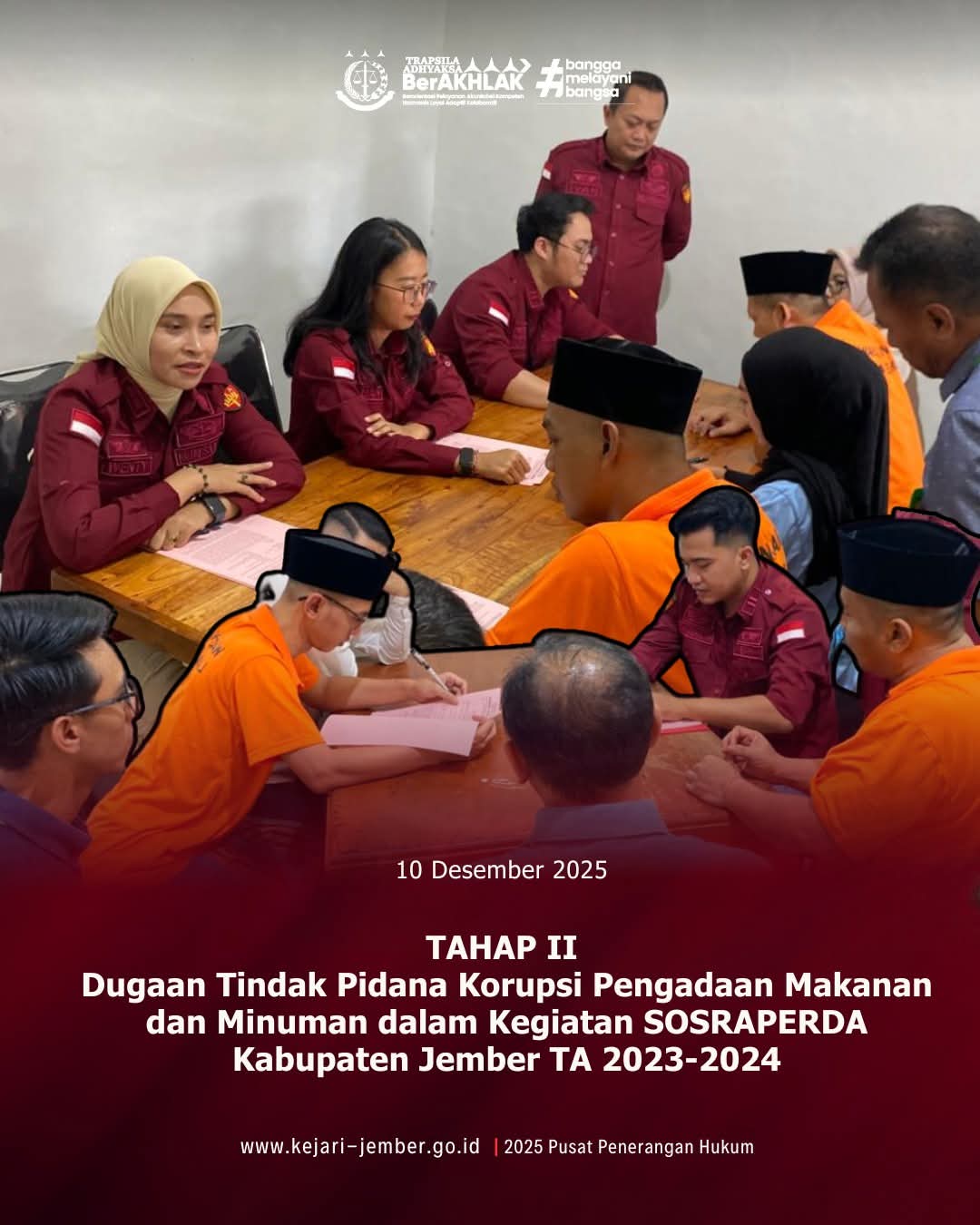 Spektroom - Kejaksaan Negeri Jember melaksanakan pelimpahan tahap II dugaan kasus Tindak Pidana Korupsi Pengadaan Makanan dan Minuman dalam kegiatan Sosialisasi Program Pembentukan Peraturan Daerah dan Rancangan Peraturan Daerah Kabupaten Jember Tahun Anggaran 2023 dan 2024 pada Sekretariat DPRD Kabupaten Jember, di-Rutan/Lapas Kelas IIa Jember, Rabu (10/12/2025).