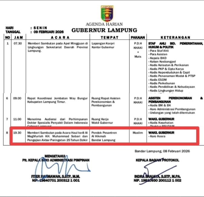 Hal itu disampaikan Wakil Gubernur Lampung Jihan Nurlela Chalim, pada Haul ke-8 Al Maghfurlah KH. Muhammad Sobari dan Pengajian Akbar Peringatan 25 Tahun Dzikir Hadiyu Lampung, di Pondok Pesantren Al Hikmah Bandar Lampung, Senin (9/2/2026) malam.